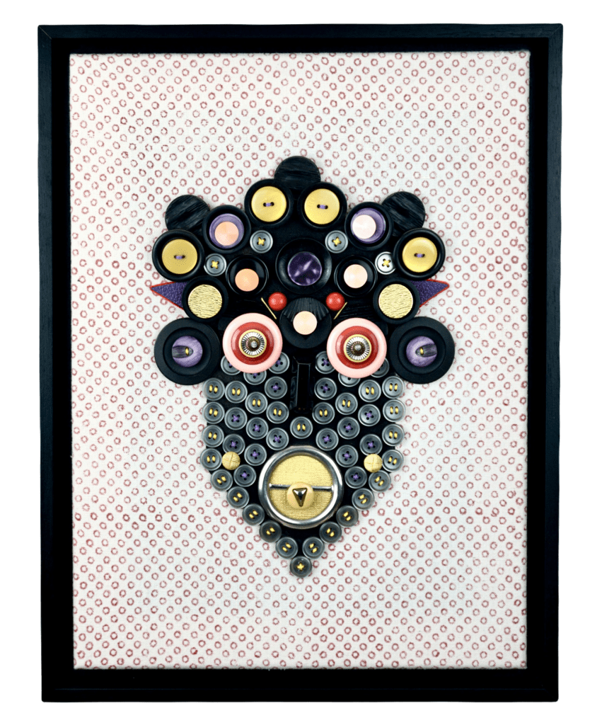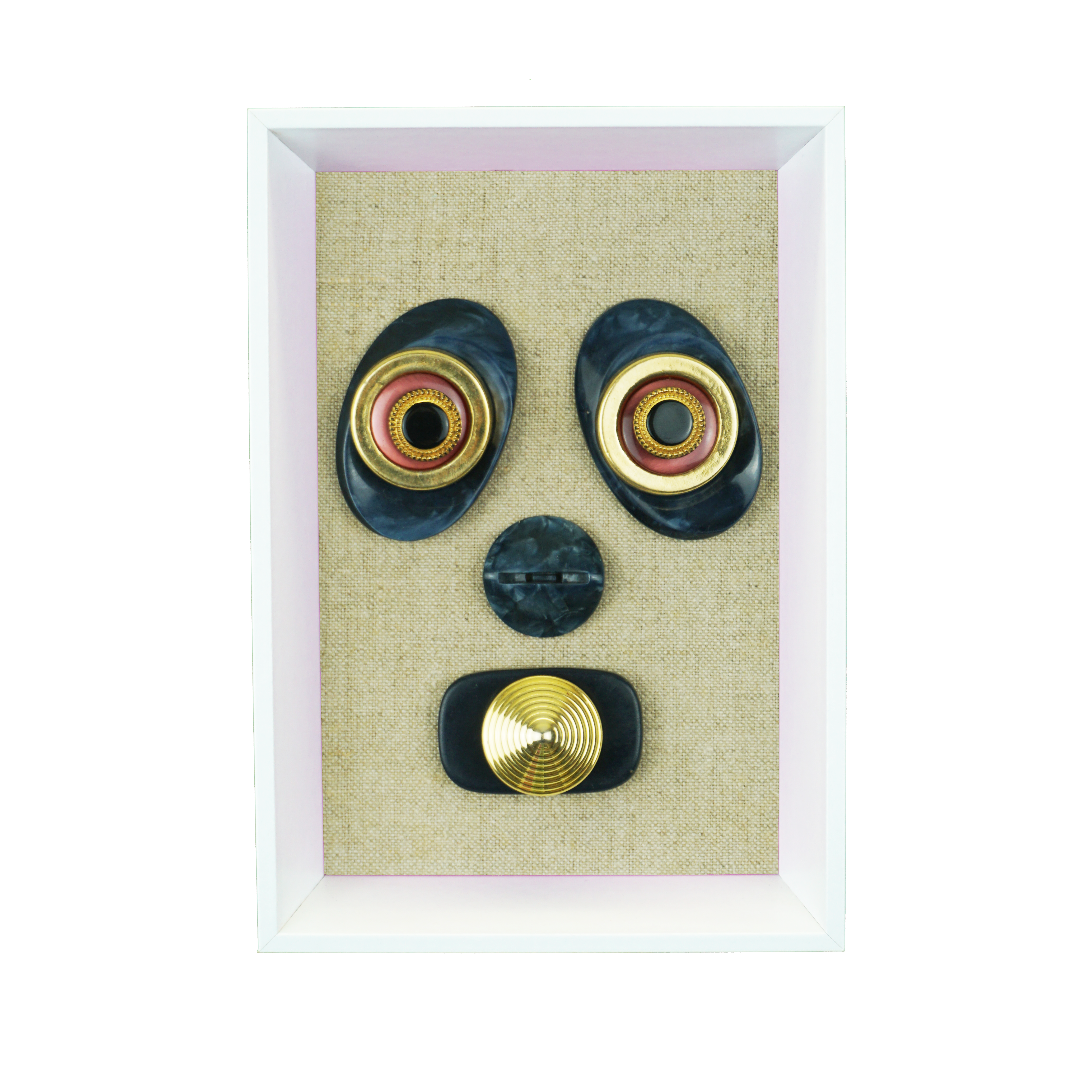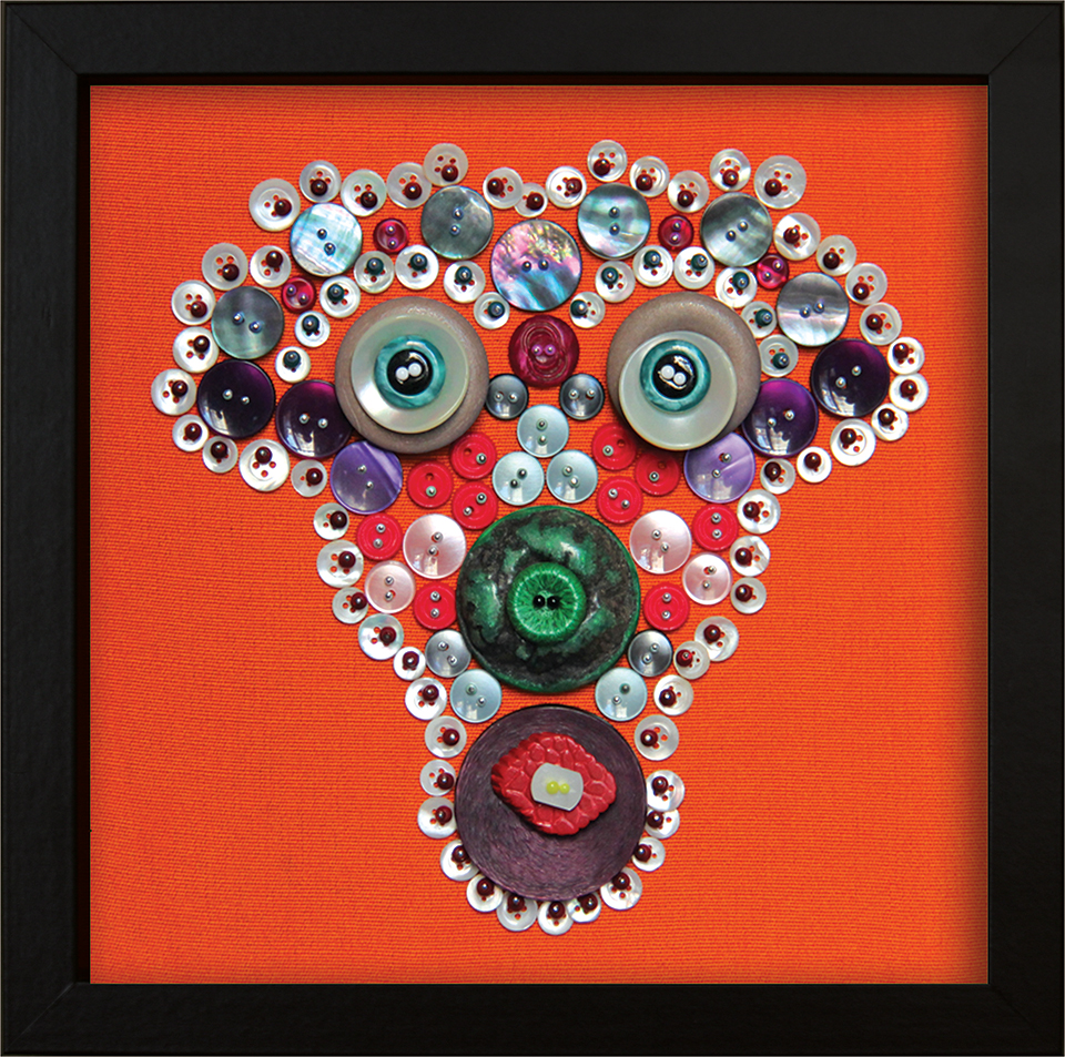 Boutons cousus et épinglés sur tissu. Cadre en bois.