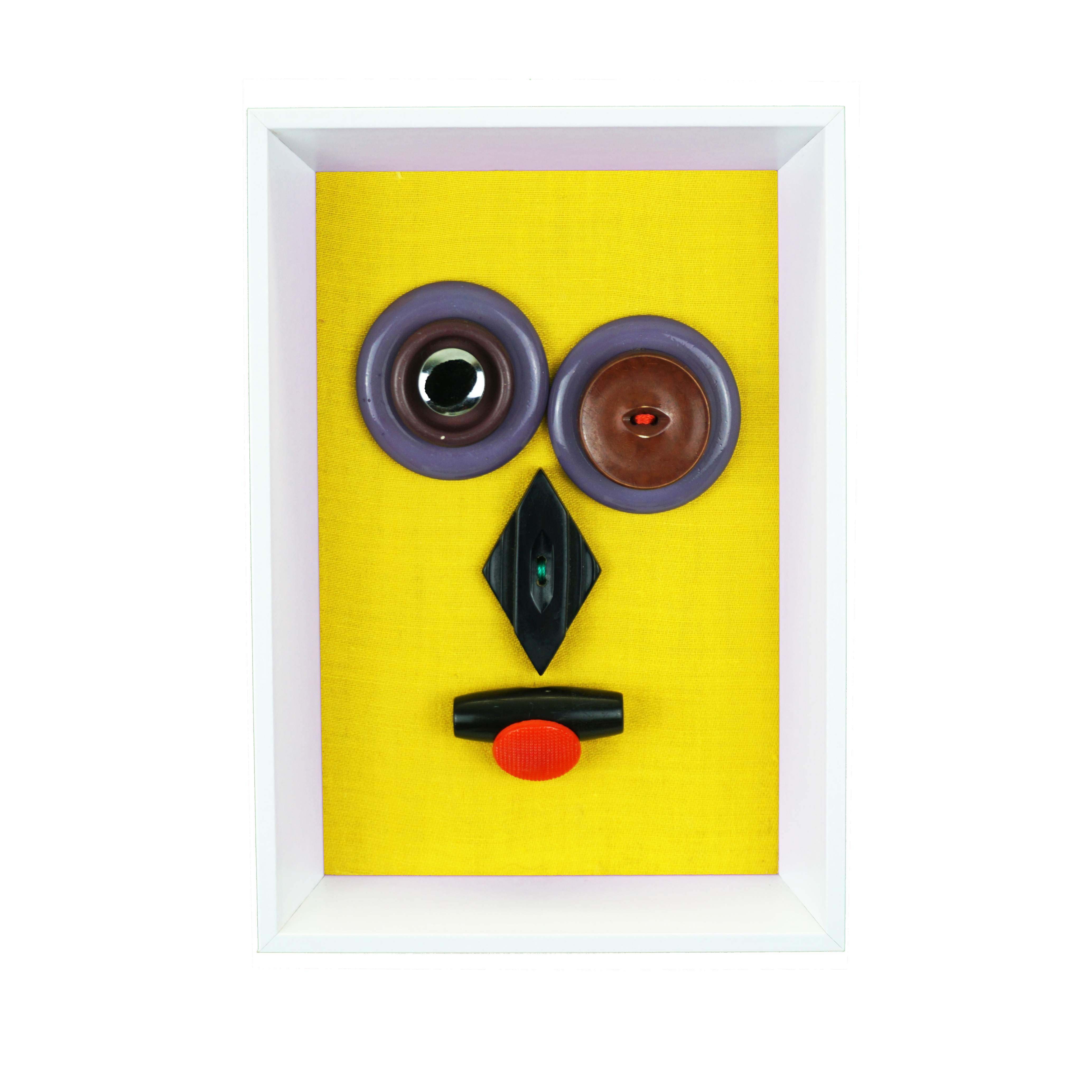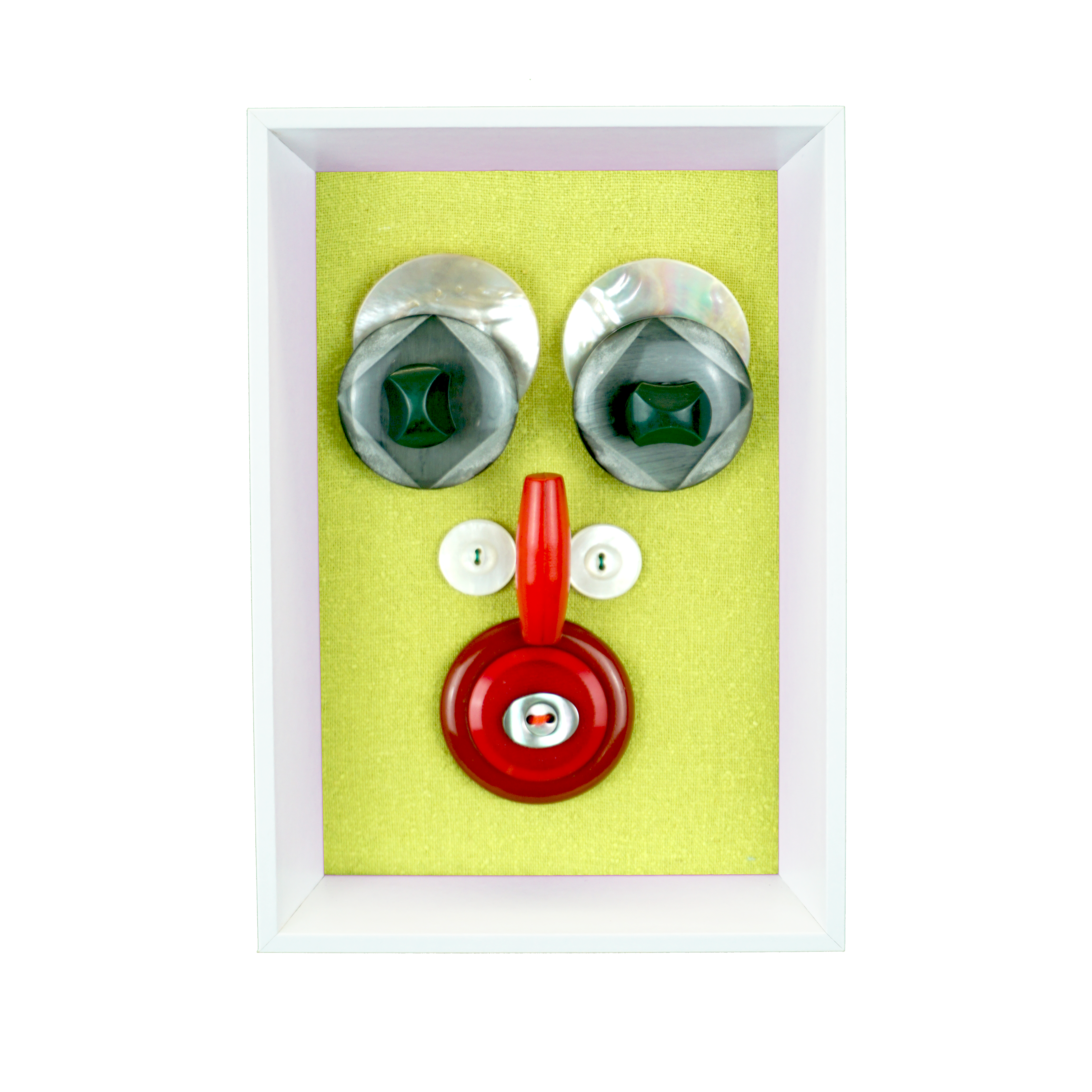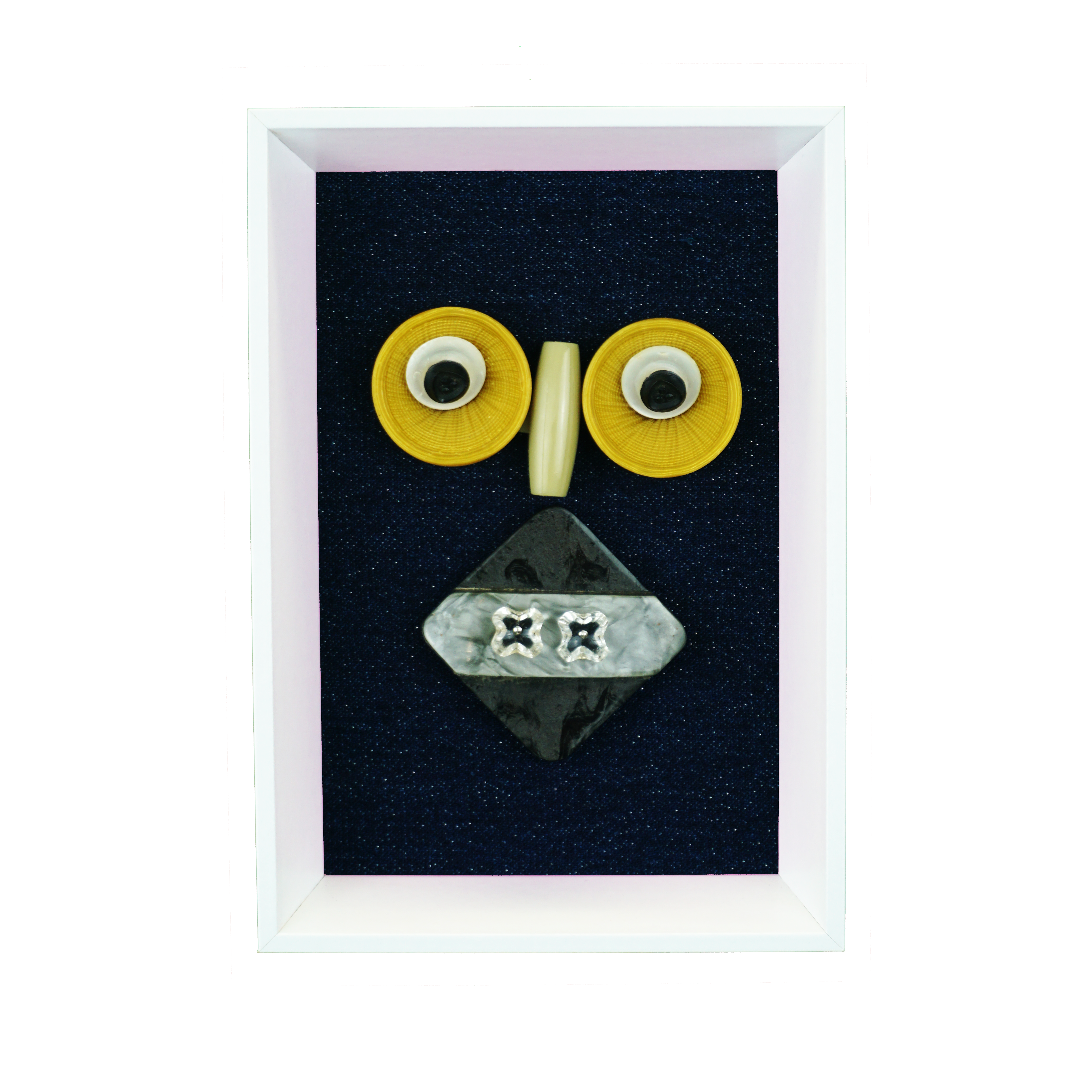 Boutons cousus et épinglés sur tissu. Cadre en bois.