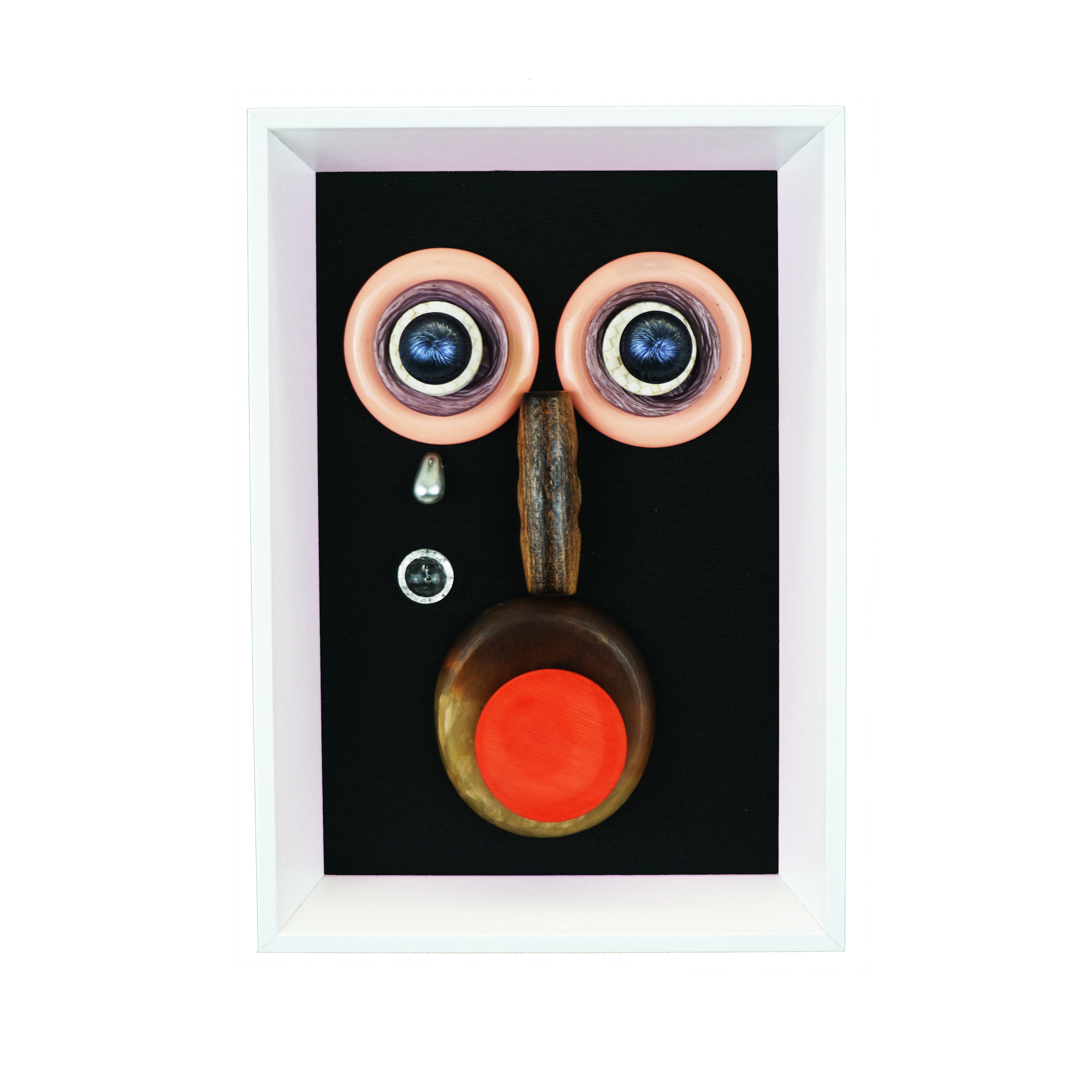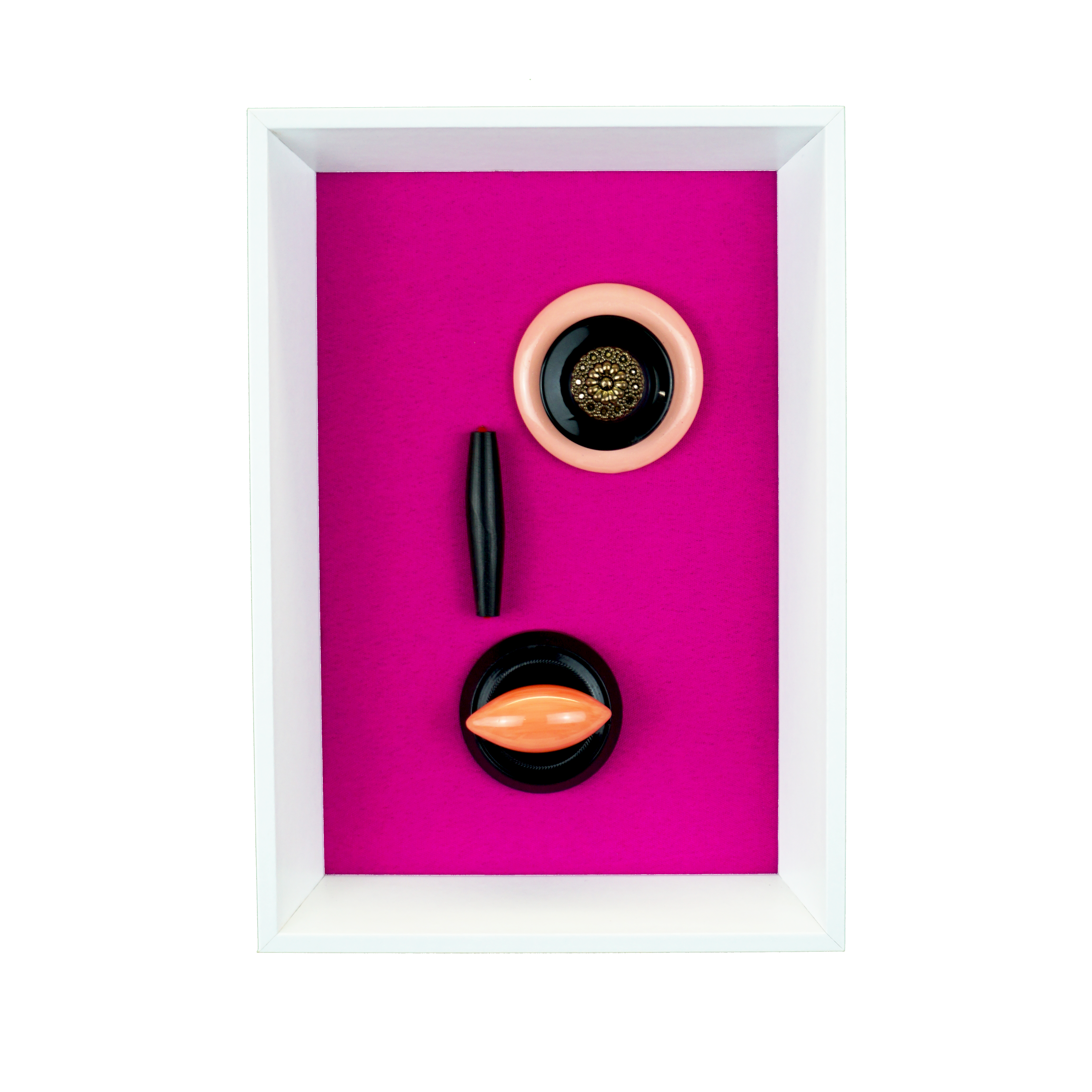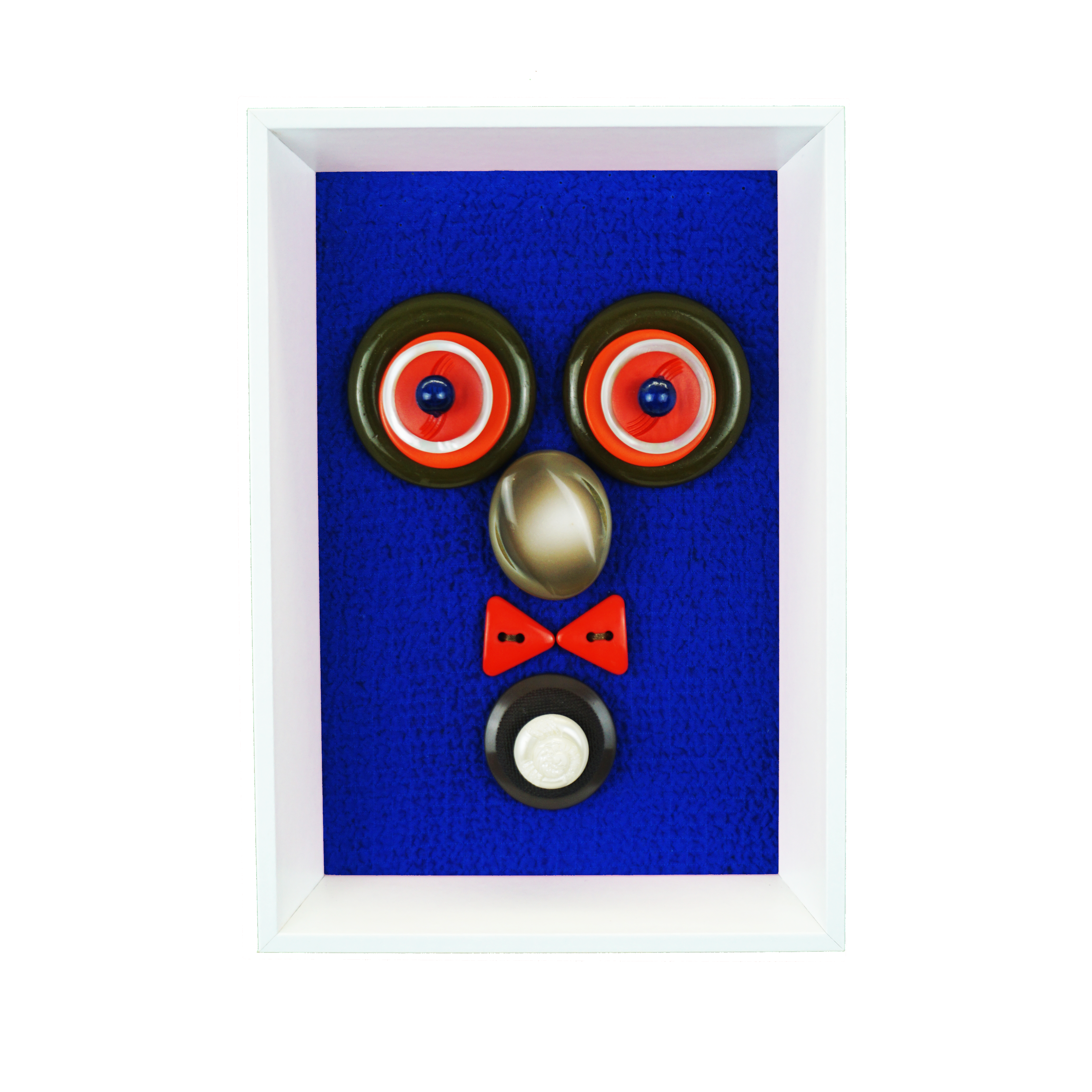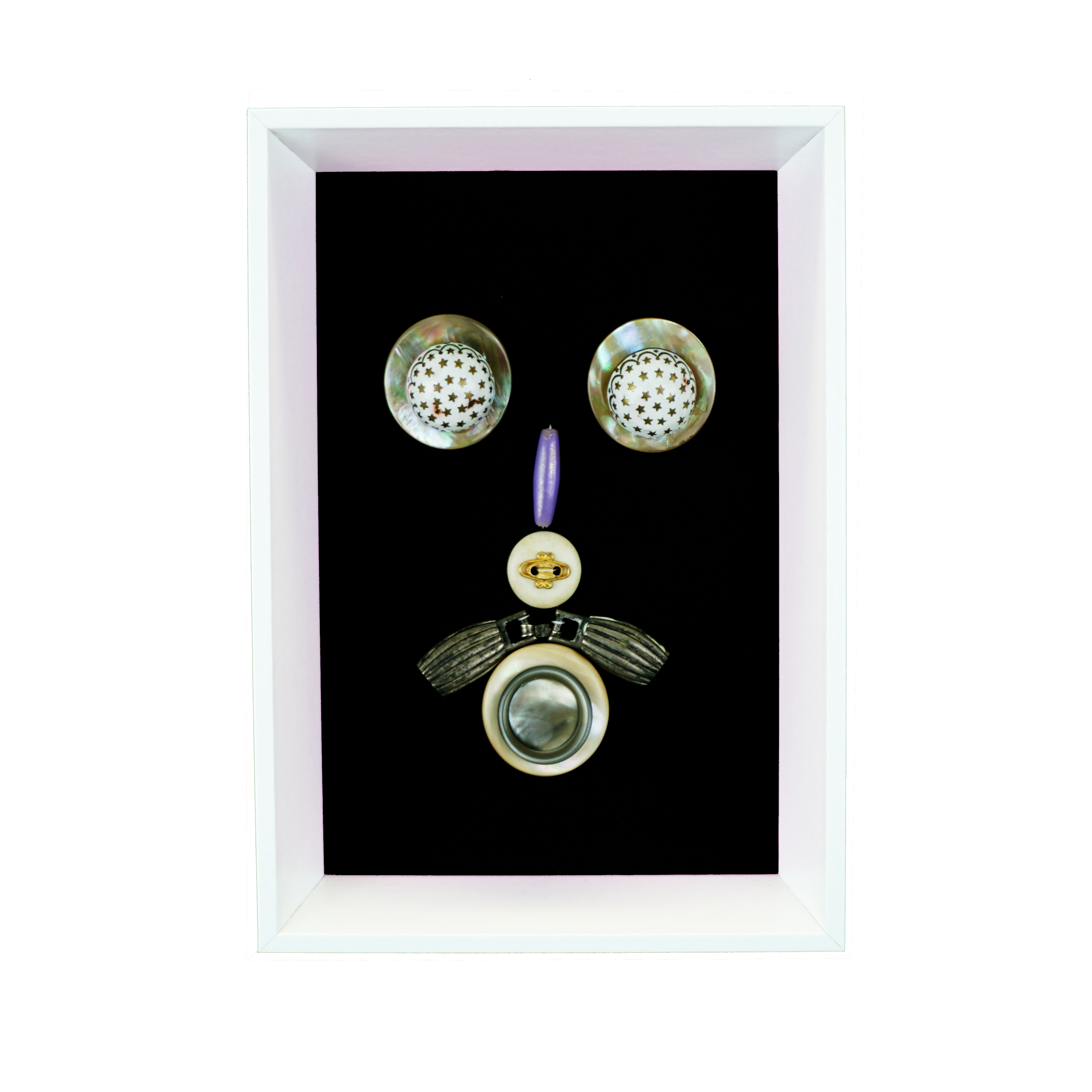Boutons cousus sur tissu, support liège cartonné. Encadrés.