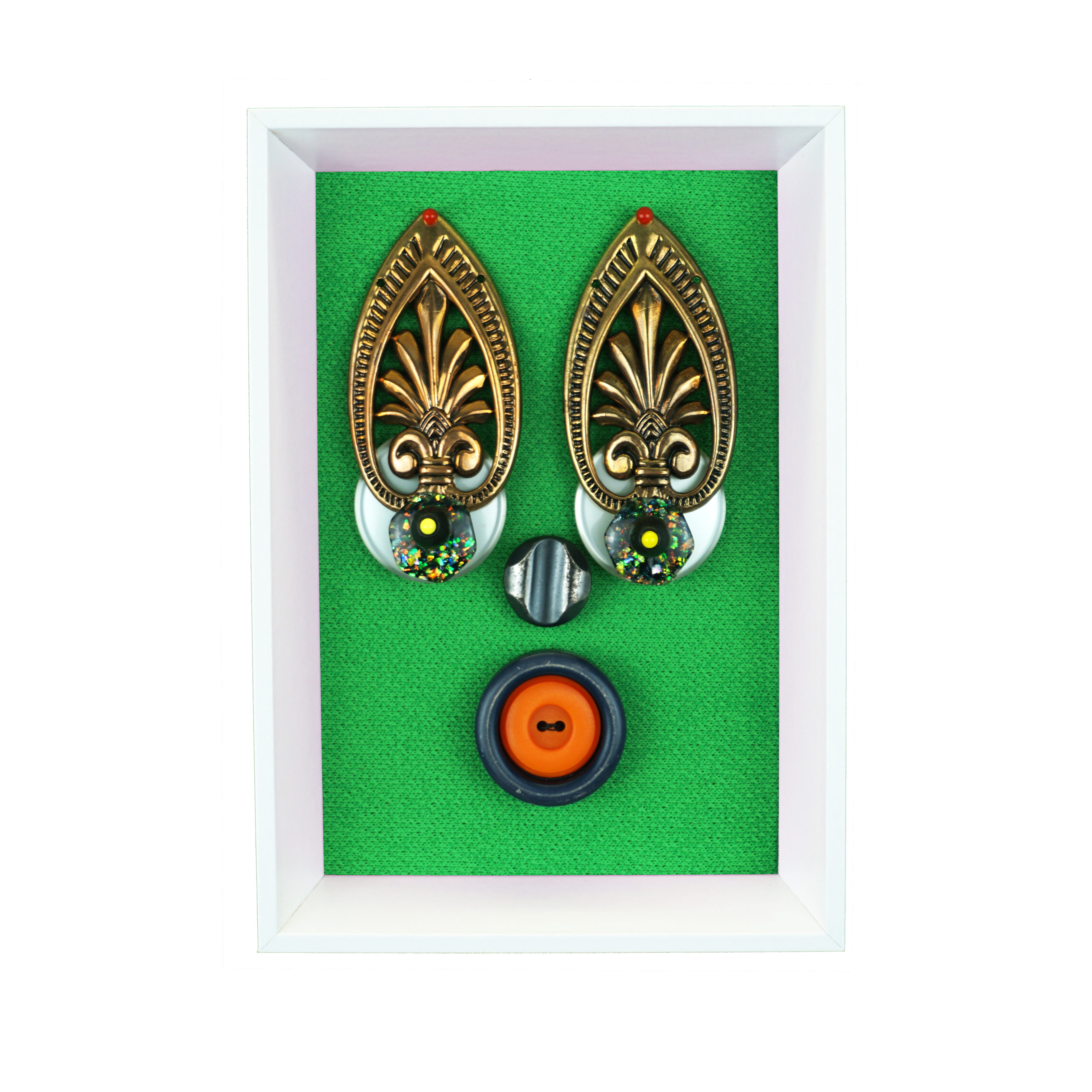 Boutons et boucle de ceinture cousus sur tissu et cuir. Cadre en bois doré.